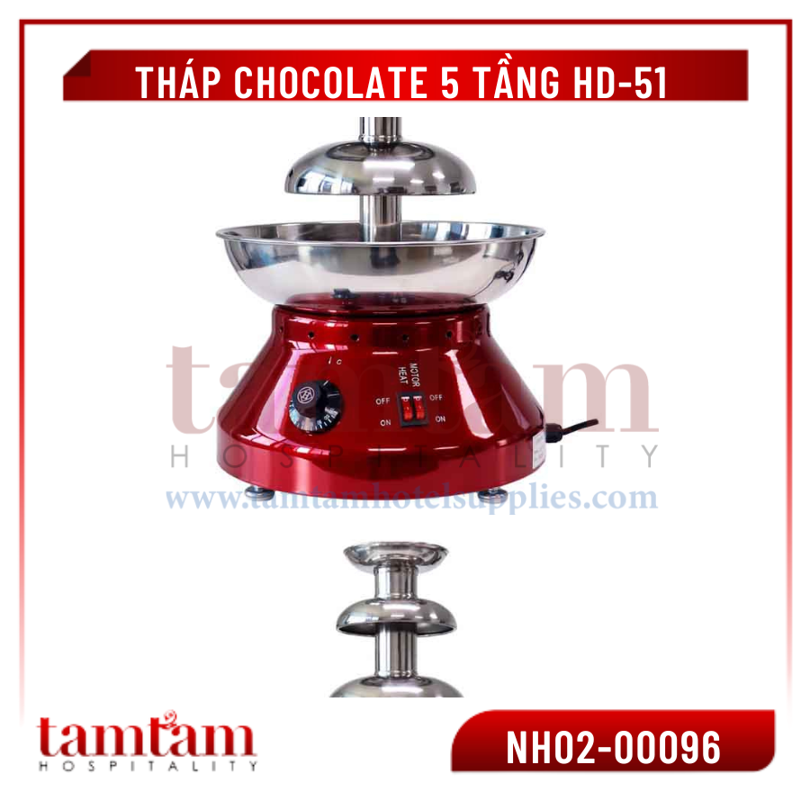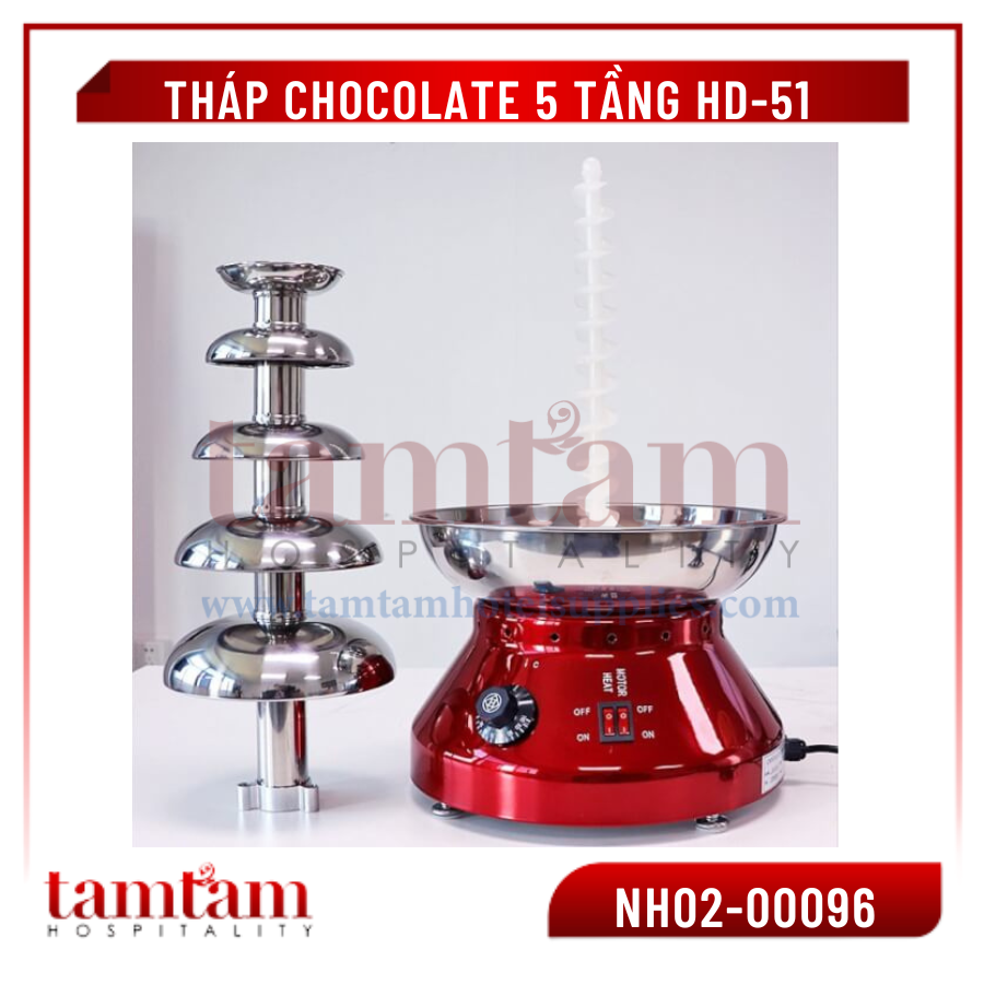 Tháp chocolate 5 tầng HD-51 được sử dụng phổ biến gồm tháp socola 3 tầng, 4 tầng, 5 tầng. Tùy từng nhu cầu mà khách hàng lựa chọn phù hợp. Thao tác sử dụng đơn giản, chỉ cần cho socola vào chân tháp và cắm nguồn điện vào, bật công tắc là tháp đã có thể hoạt động.